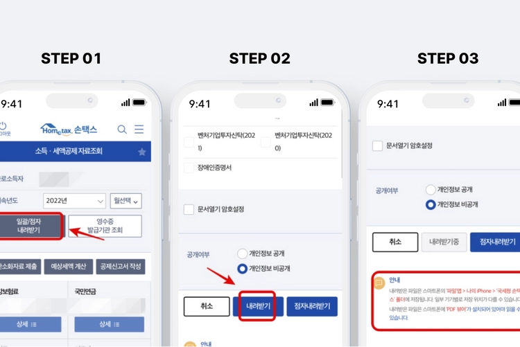 한번에 조회하기 버튼을 누르셔서 조회 한뒤 문서를 내려받으시면 됩니다.